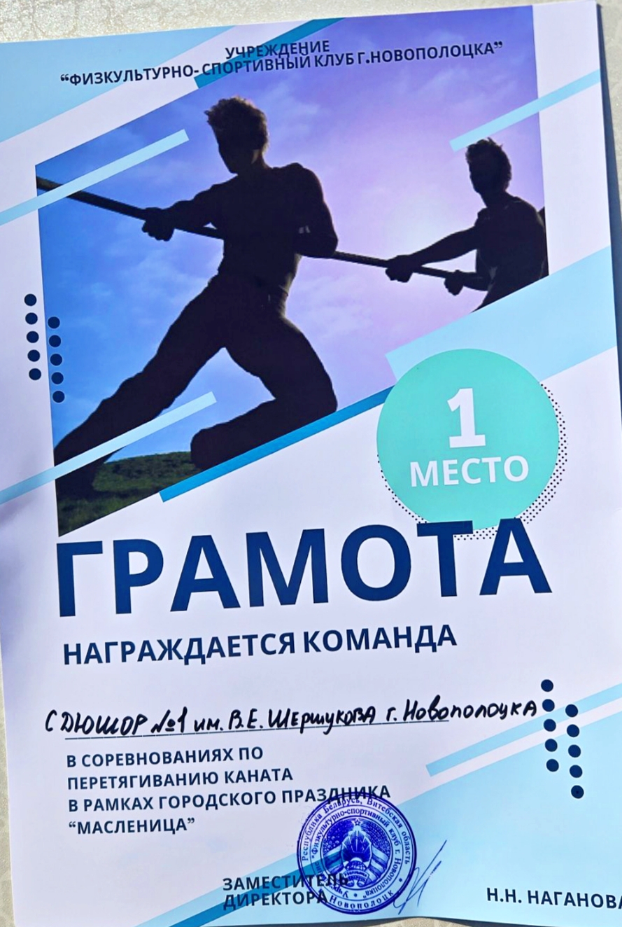 Поздравляем! Поздравляем команду самых сильных юношей учреждения «СДЮШОР 1 им.В.Е.Шершукова г.Новополоцка» по перетягиванию каната. Читайте также: Открытое первенство Витебской области по лёгкой атлетике г.Гомель1-2 февраля 2024г. — Чемпионат Беларуси по многоборьям Торжественное открытие первенства г.Новополоцка по легкой атлетике 14-15.12.2023 г.Новополоцк, СК «Атлант» Открытое первенство города Новополоцка по лёгкой атлетике Объявление